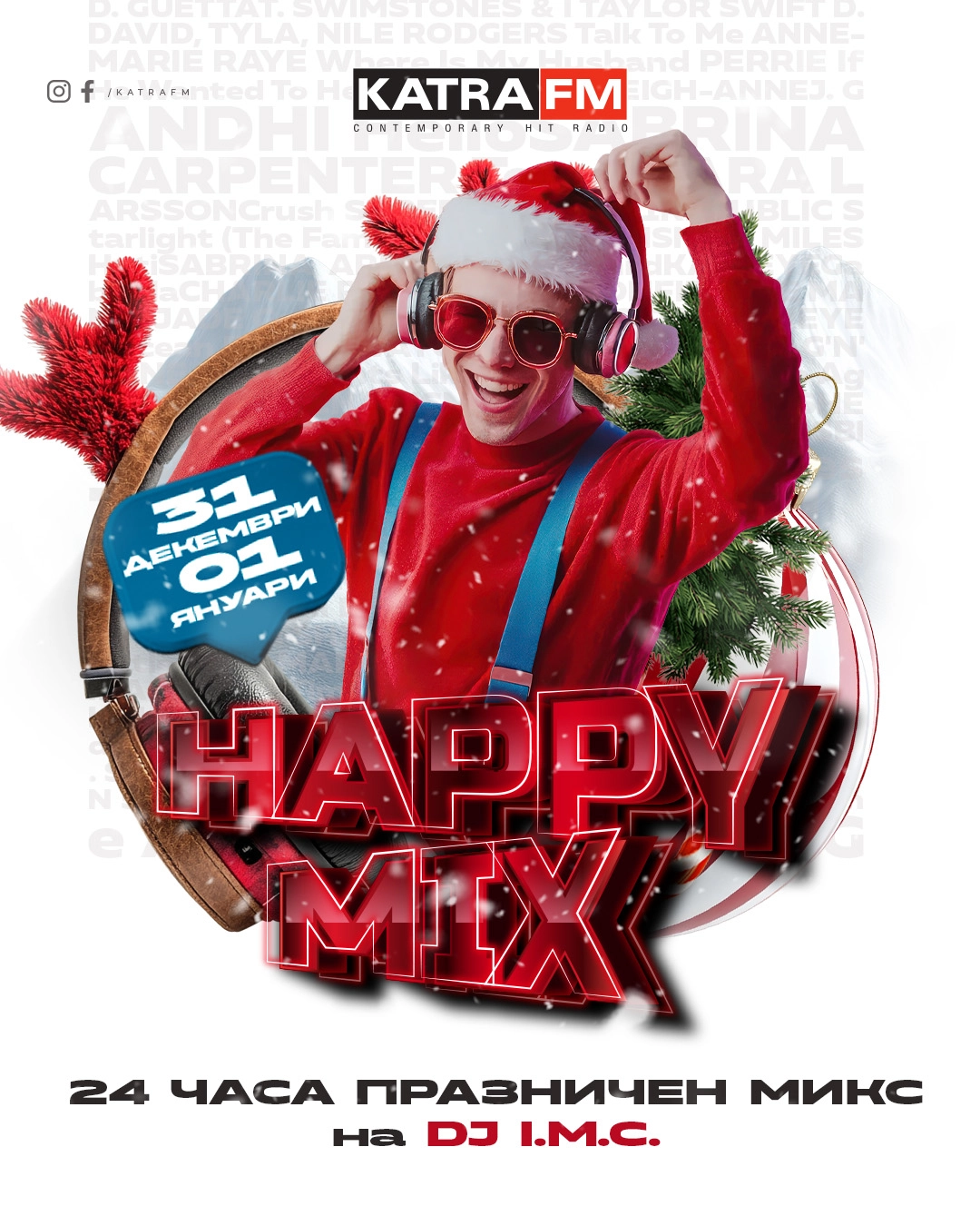 На 31 декември 2025 г. точно в 12:00 на обяд, стартира единствената по рода си 24-часова музикална програма на KATRA FM – HAPPY MIX. Ако все още не сте решили как да изпратите годината, ние ви предлагаме най-добрия сценарий: миксирате я с тоталните хитове, които владееха света през последните 365 дни. Нестихваща енергия, убийствен саунд и неповторима атмосфера ще бъдат събрани в един единствен, мащабен 24-часов DJ сет, миксиран от DJ I.M.C.